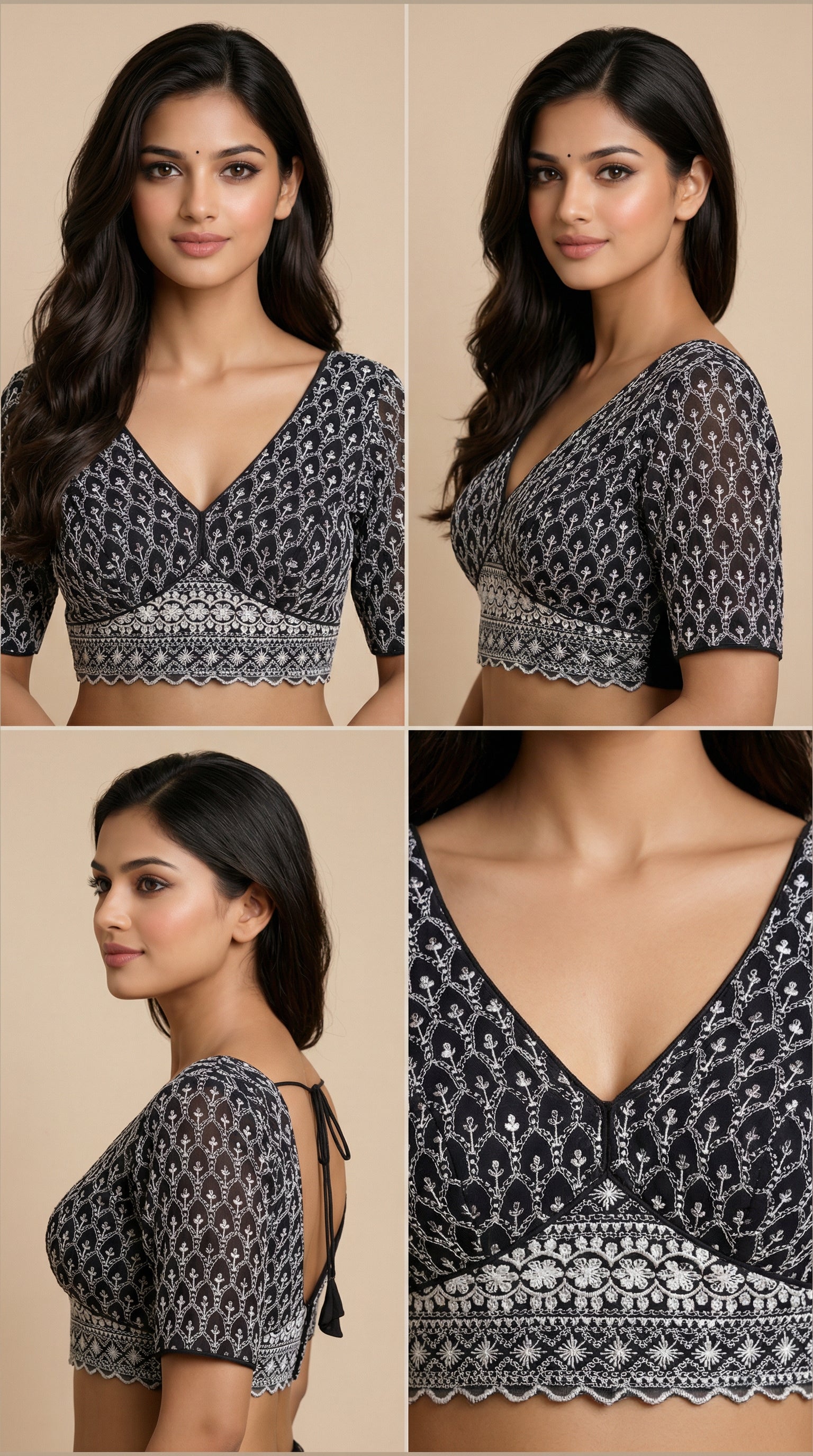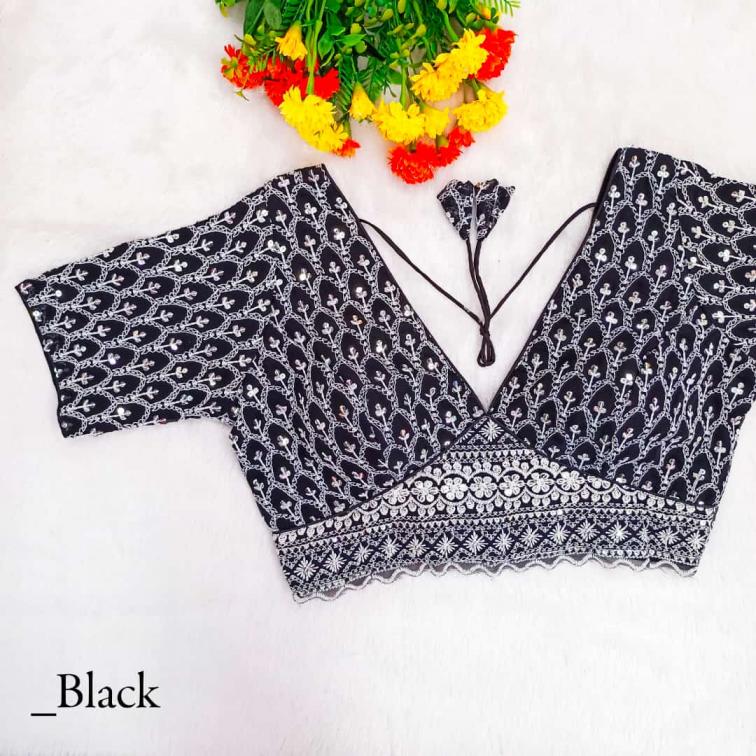 Black Lucknowi Embroidered Georgette V-Neck Padded Saree Blouse
