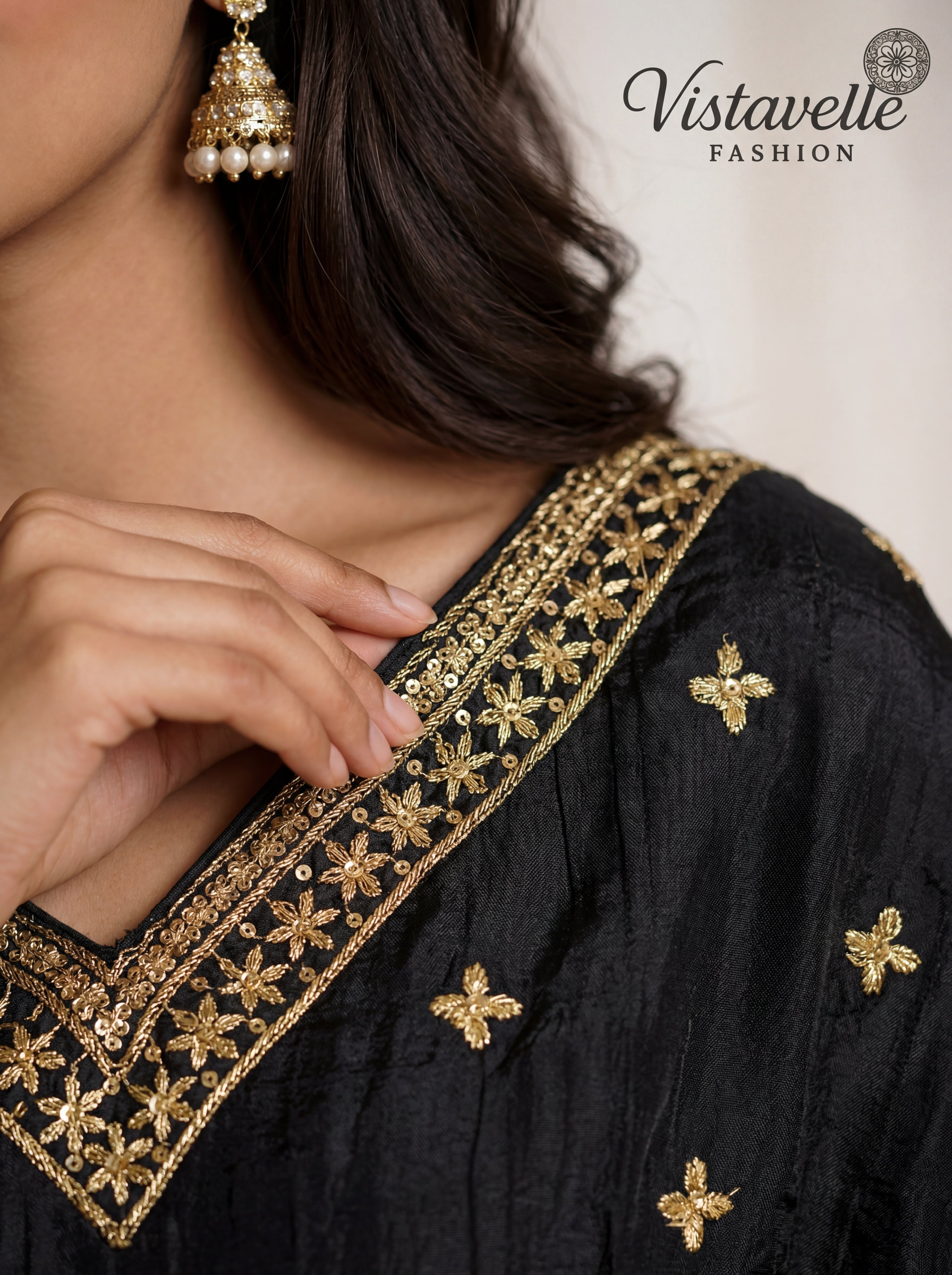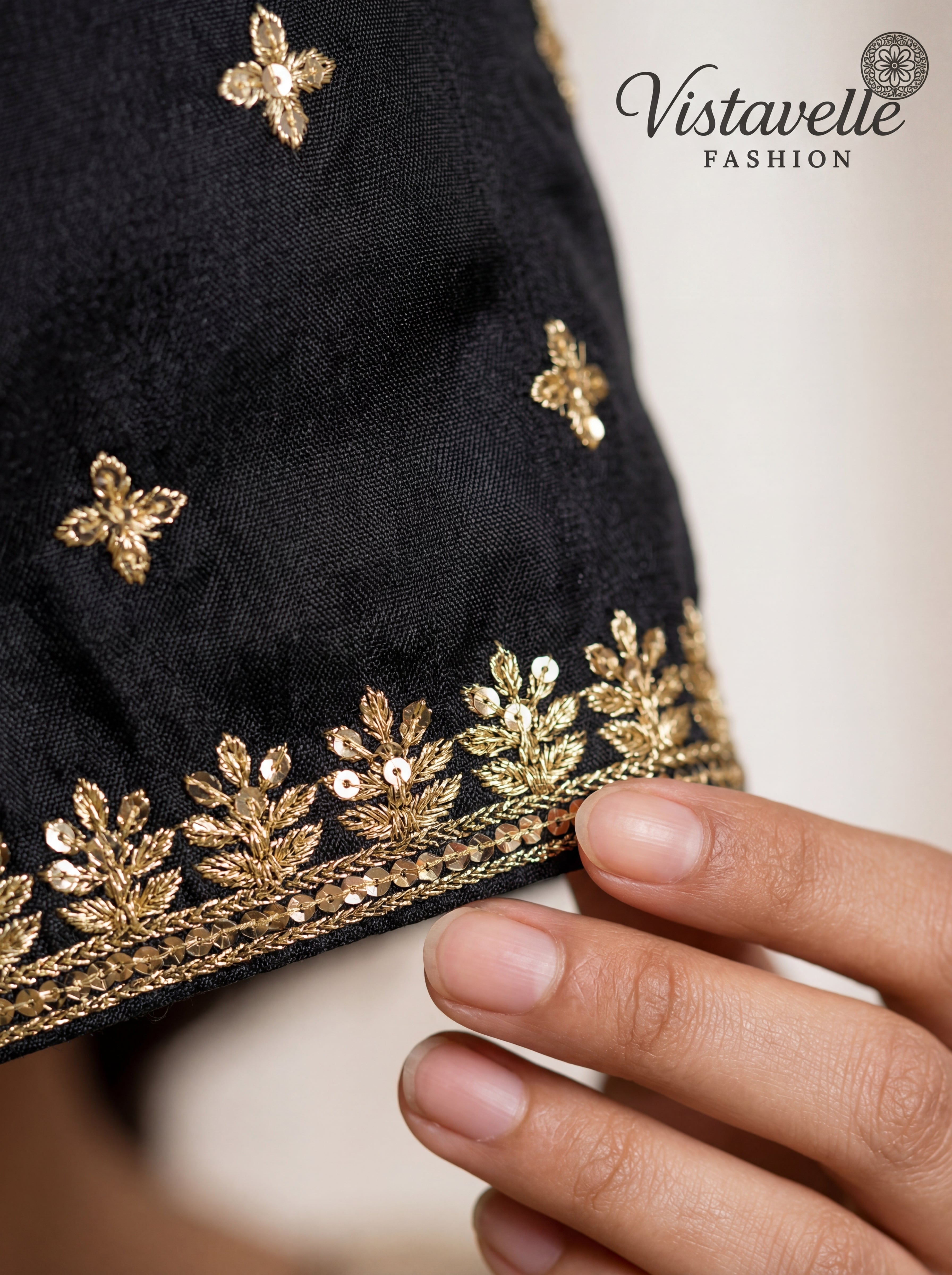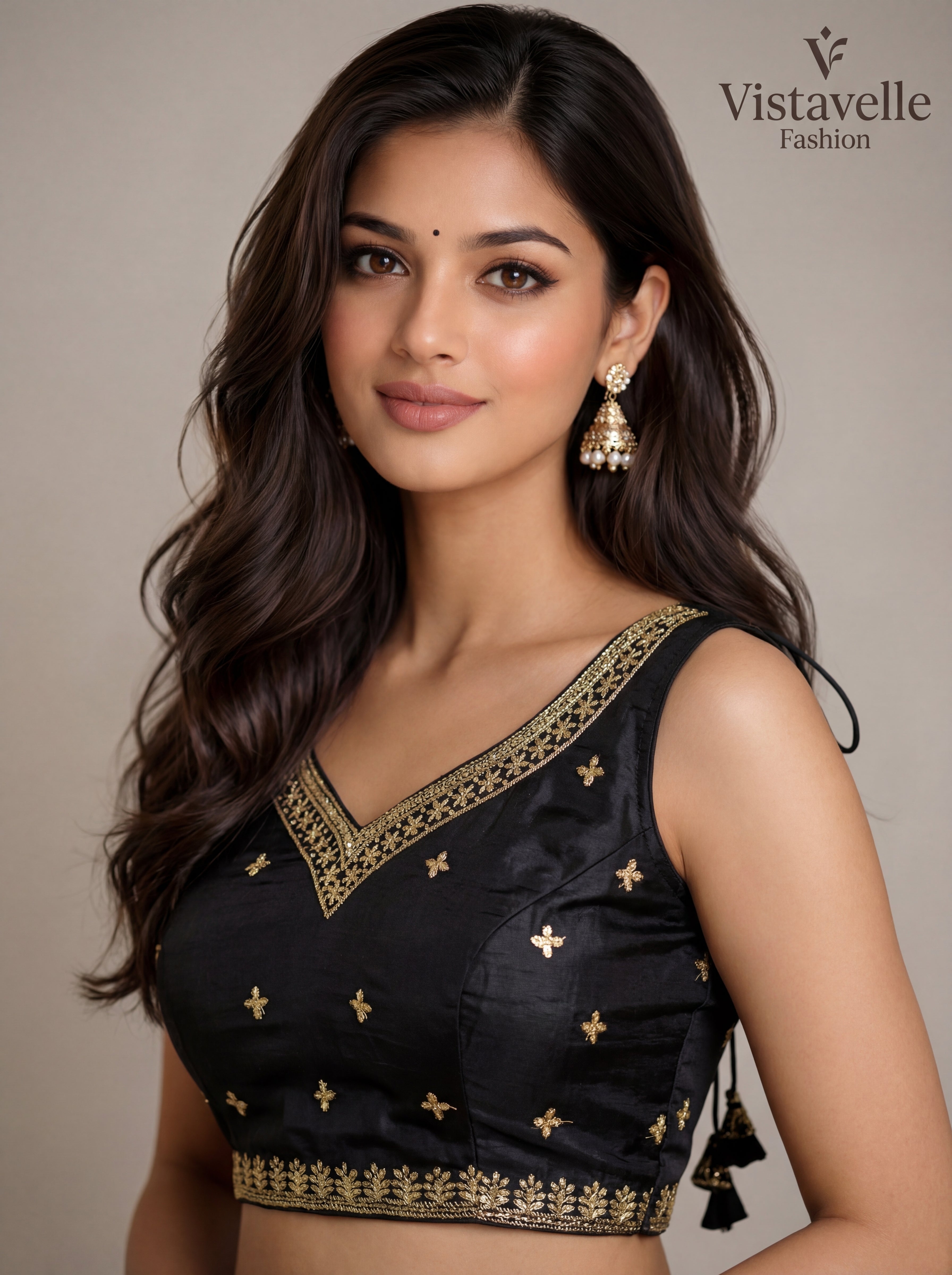 Black Jari Embroidered V-Neck Blouse – Designer Sequence Work Ethnic Blouse | Ships from USA