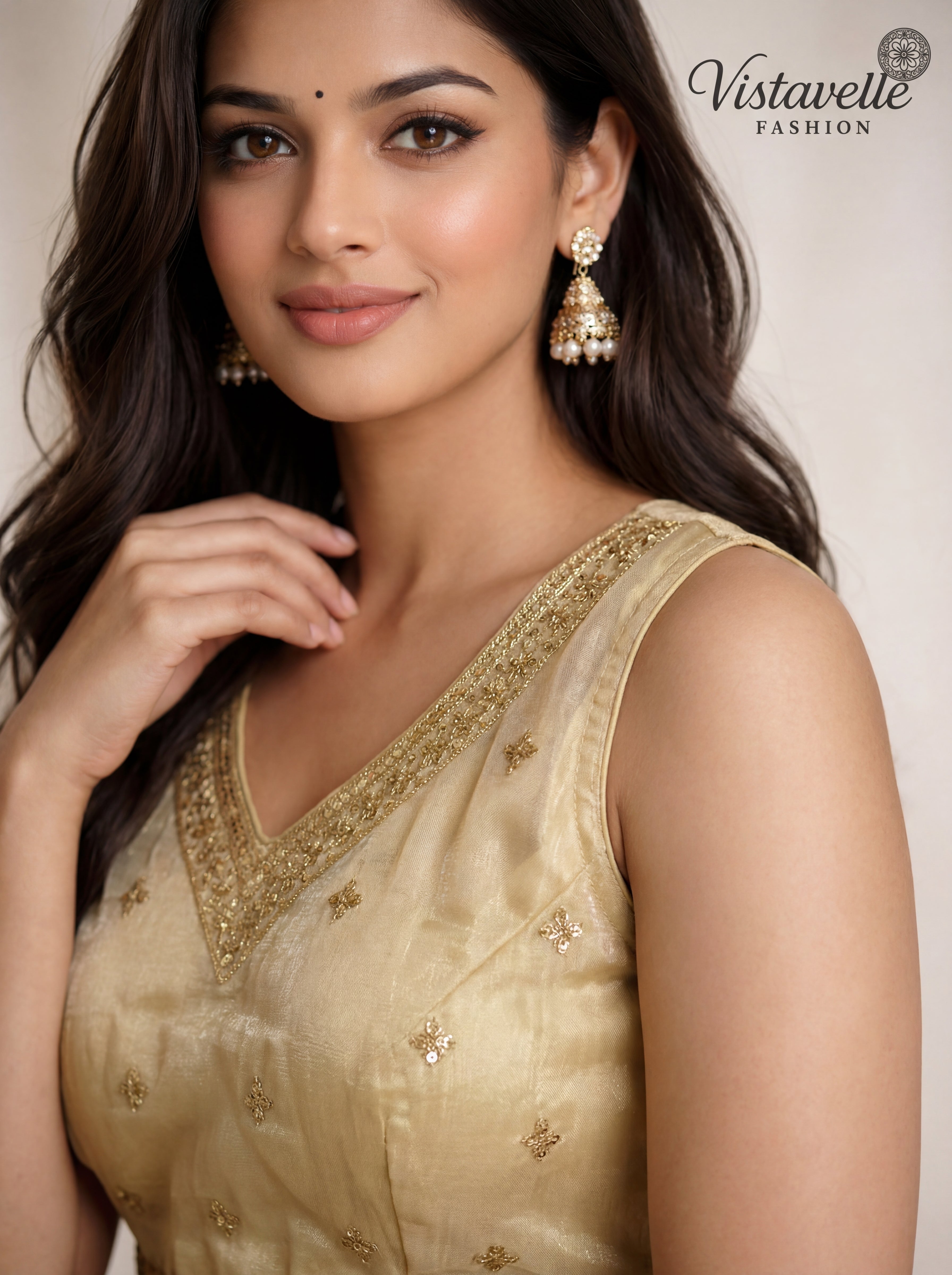 Champagne Gold Tissue Georgette Saree with Embroidered Stitched Blouse – Luxury Wedding & Reception Wear | Ships from USA