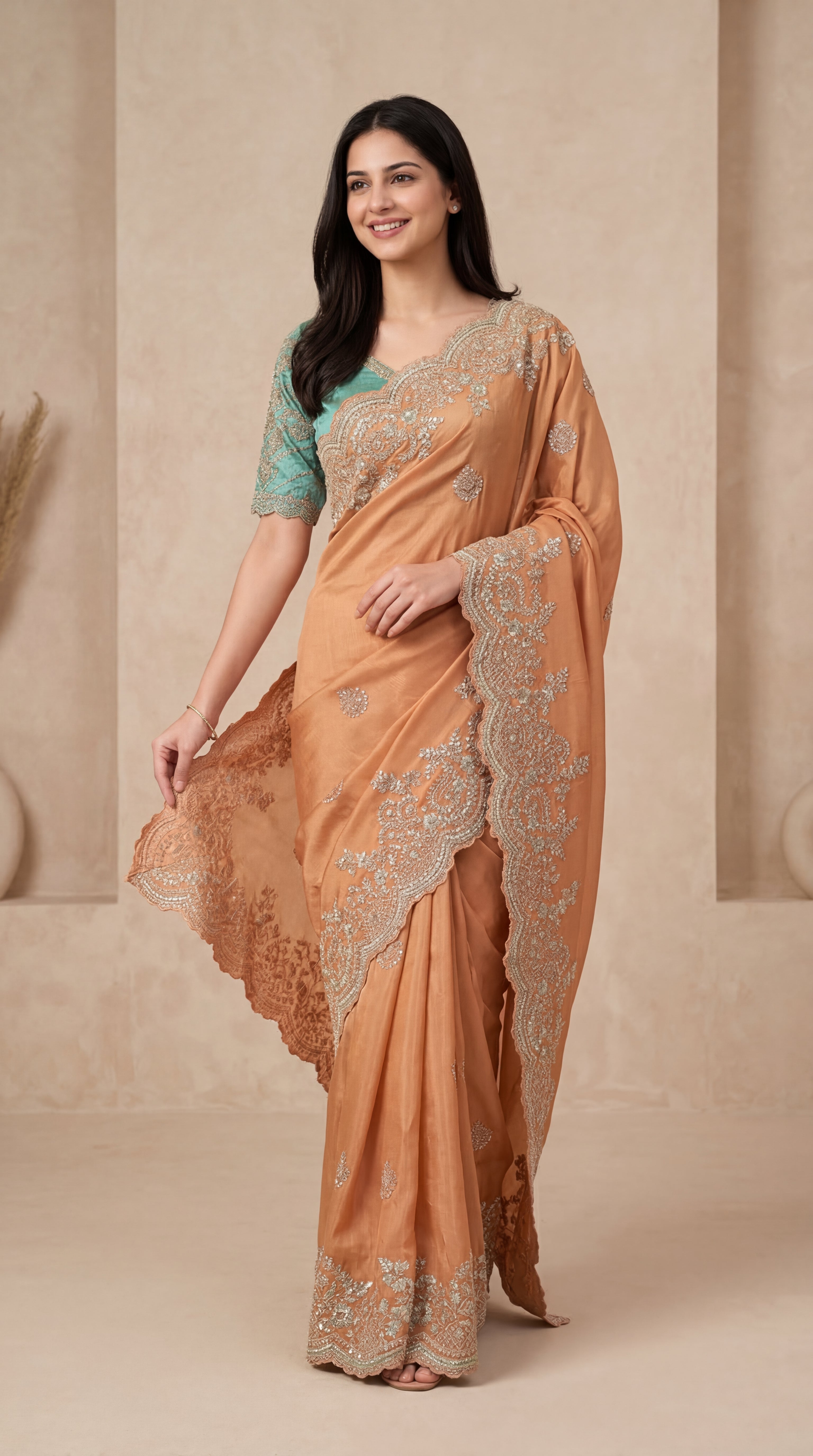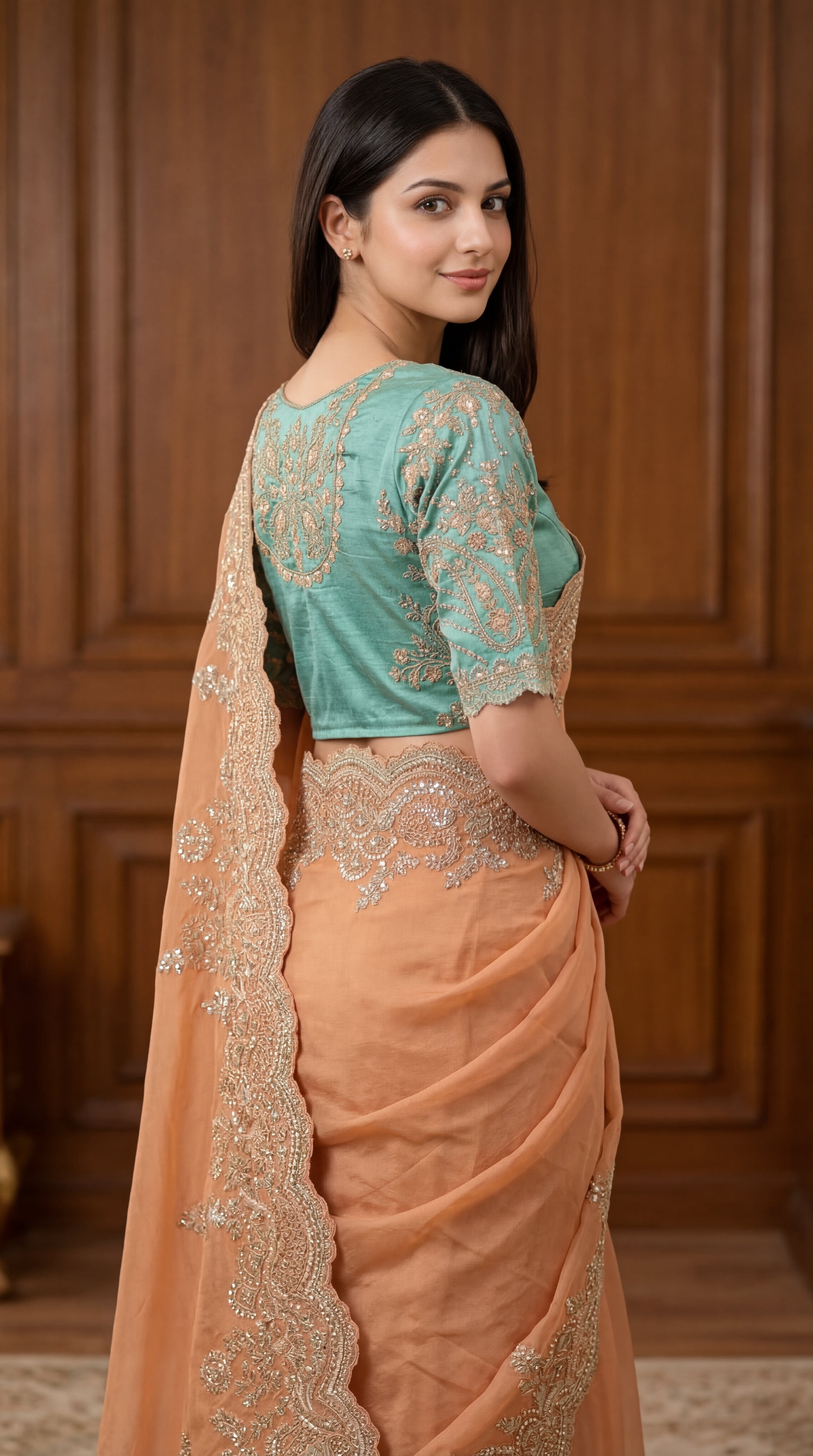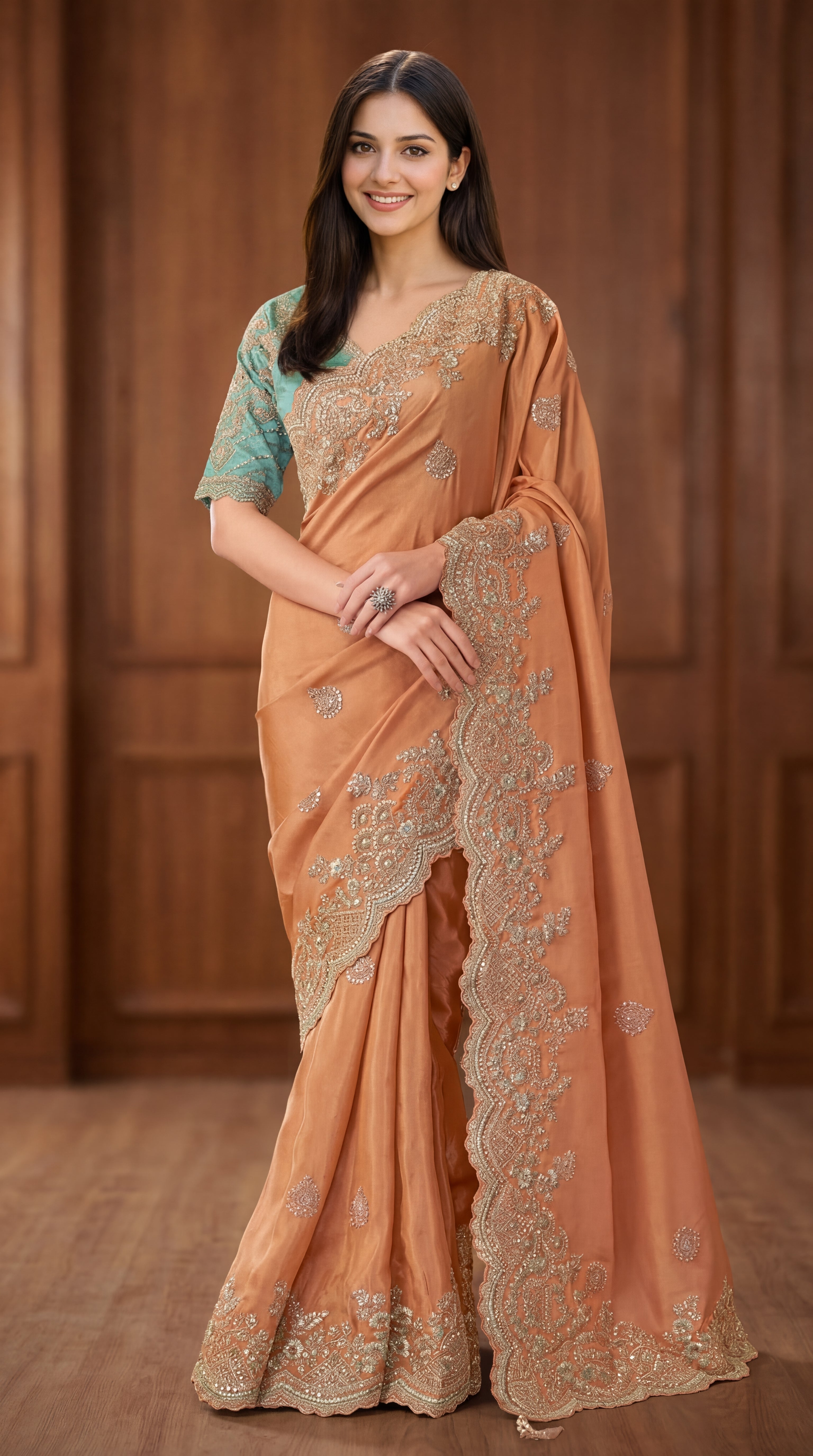 Amber Mist Embroidered Silk Saree | Copper Gold with Aqua Blouse