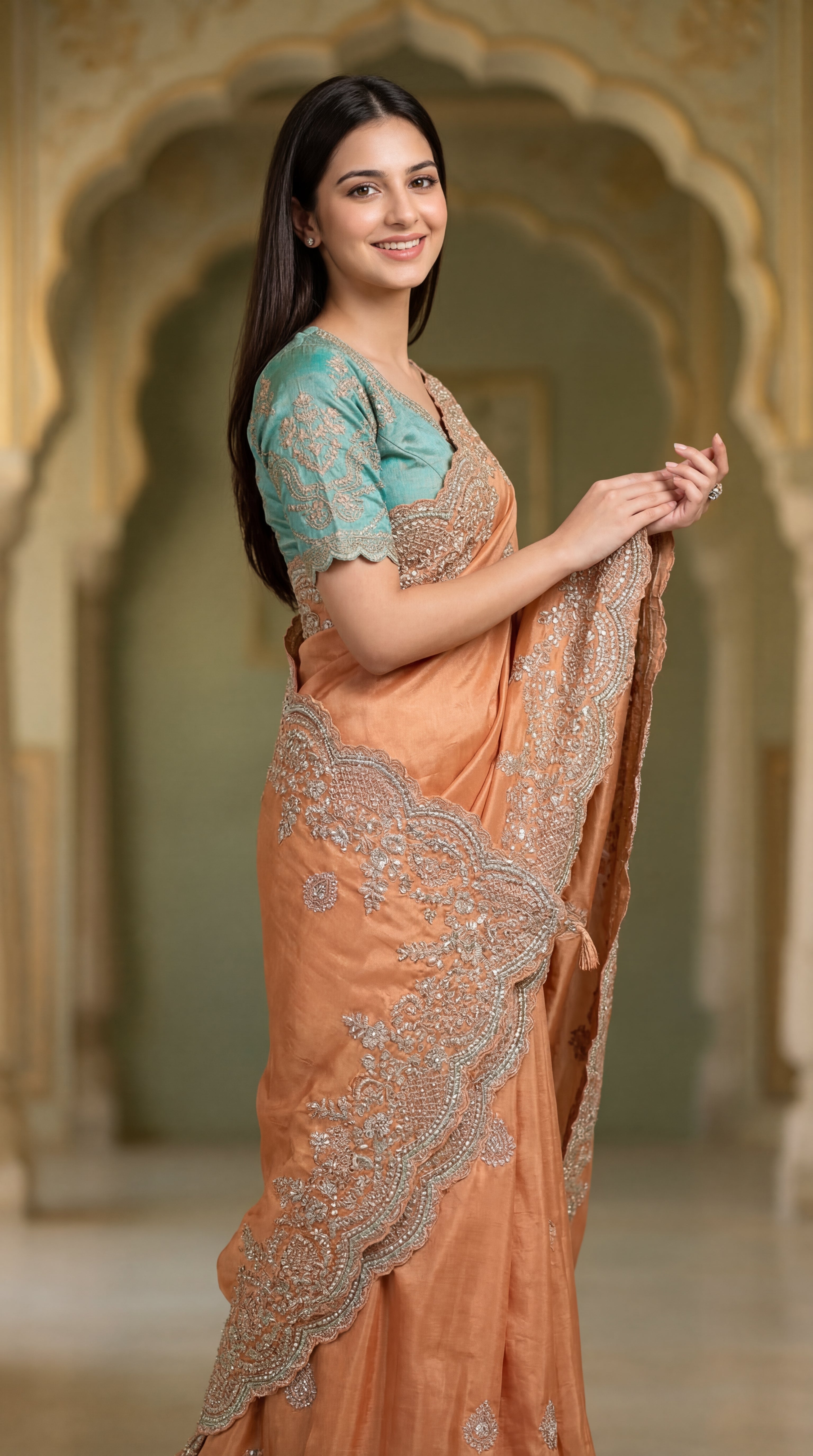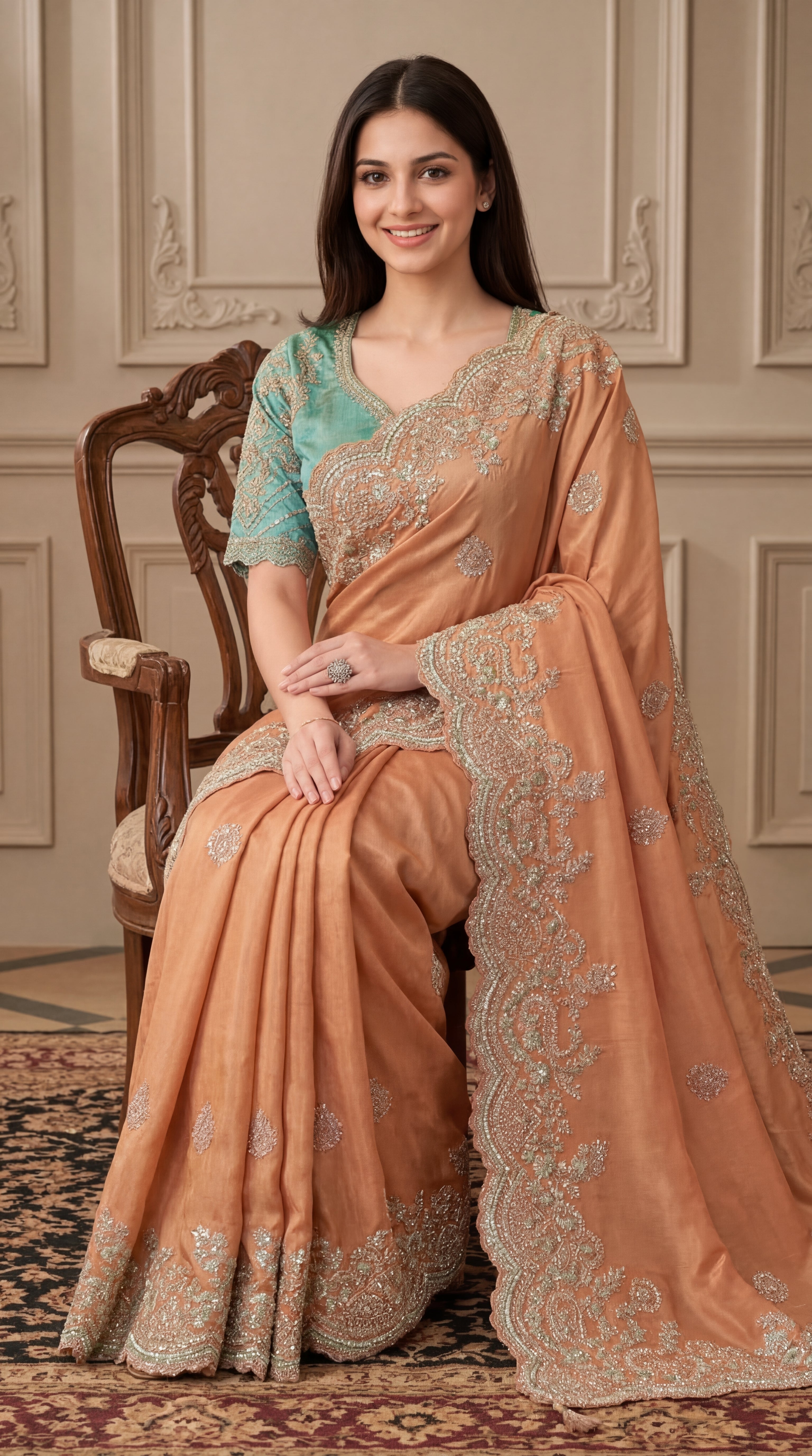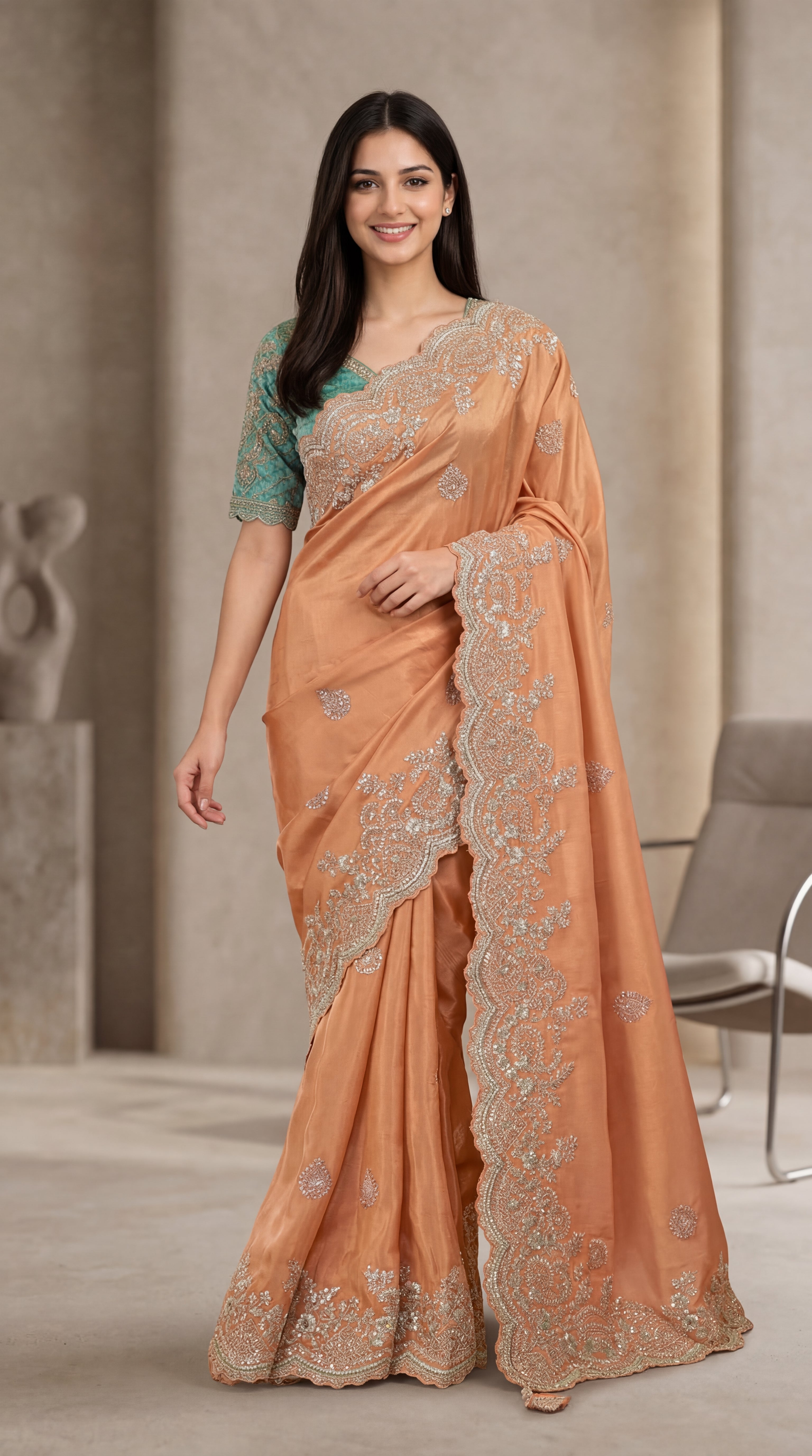 Amber Mist Embroidered Silk Saree | Copper Gold with Aqua Blouse