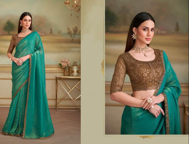 Rich and majestic, this Green Gold Georgette Saree blends traditional elegance with contemporary refinement. The luminous georgette drape flows gracefully, while the intricately embroidered stitched blouse adds a royal finish.