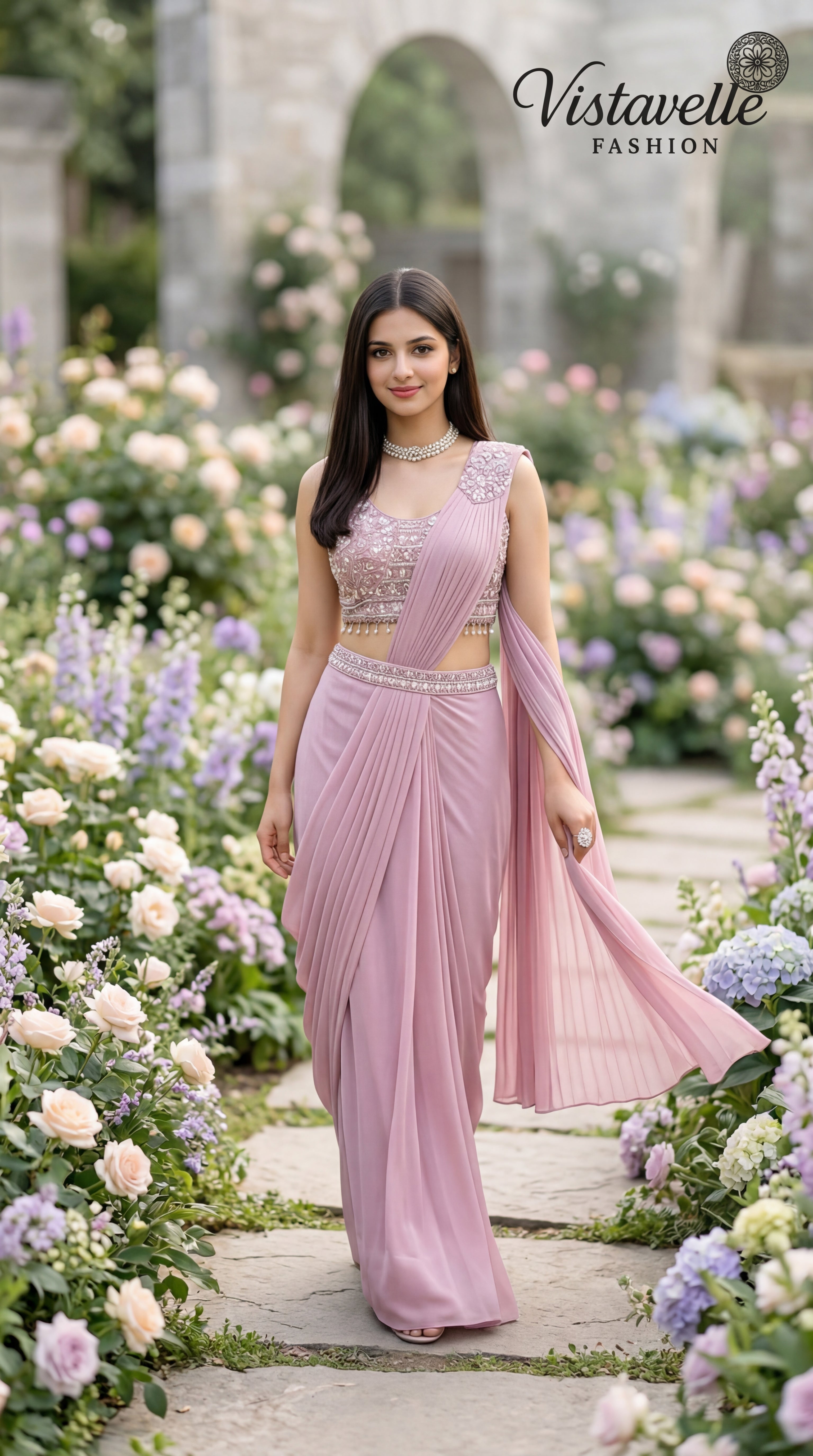 This saree offers a ready-to-wear silhouette, giving you a flawless drape in seconds while maintaining a luxurious, designer look.
