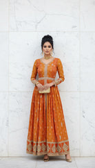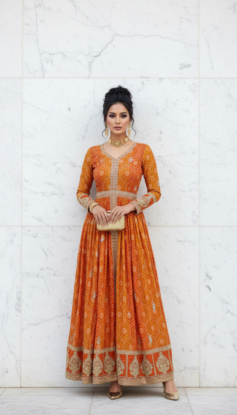 Orange Fully Stitched Party Wear Chinon Silk Gown, Pant and Dupatta