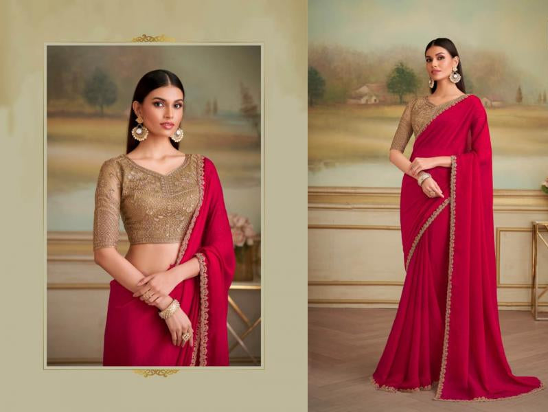 Radiate timeless elegance in this luxurious Cherry Red Georgette Saree, designed for weddings, receptions, and grand celebrations. The fluid drape enhances your silhouette while the delicate golden border detailing adds refined festive charm.