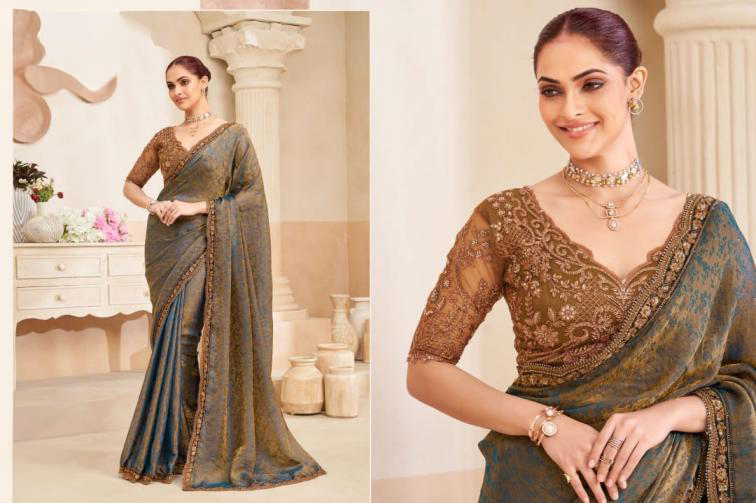 Discover regal elegance with this high-end saree, thoughtfully designed for grand celebrations and memorable occasions. Crafted to deliver a luxurious presence, the saree features a sophisticated two-tone shimmer finish that subtly transforms under different lighting, adding depth, movement, and refined allure to every drape.