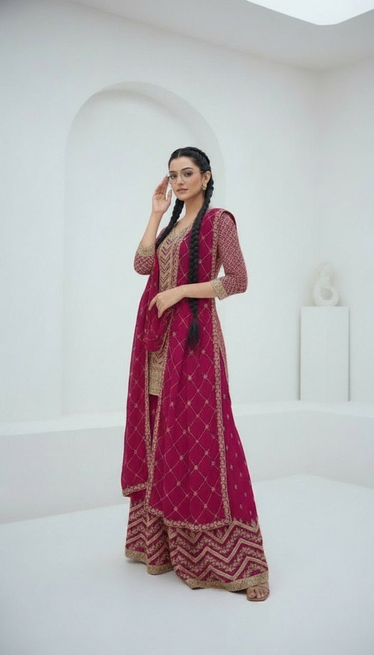 Ideal for those seeking premium ethnic wear with timeless charm, this palazzo suit set combines elegance, comfort, and ready-to-wear convenience.