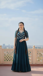 Style this gown with statement earrings and elegant heels for festive or evening occasions. Keep accessories minimal to let the embroidery and flare stand out. A sleek bun or soft waves will beautifully complement the fancy neckline.