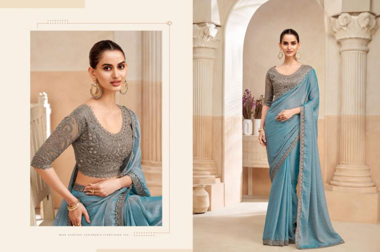 Pair this saree with statement earrings and elegant heels for wedding or reception looks. For evening celebrations, elevate the ensemble with bold accessories and a sleek hairstyle to highlight the shimmer finish and embroidered blouse.