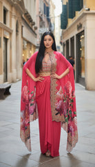 The set features a stylish digitally enhanced handwork jacket layered over a delicately hand-embellished blouse, paired with a modern dhoti-style bottom. The combination creates a striking silhouette that balances tradition-inspired elements with a contemporary western aesthetic. Lightweight yet luxurious, the fabric ensures comfort while maintaining an elevated finish.