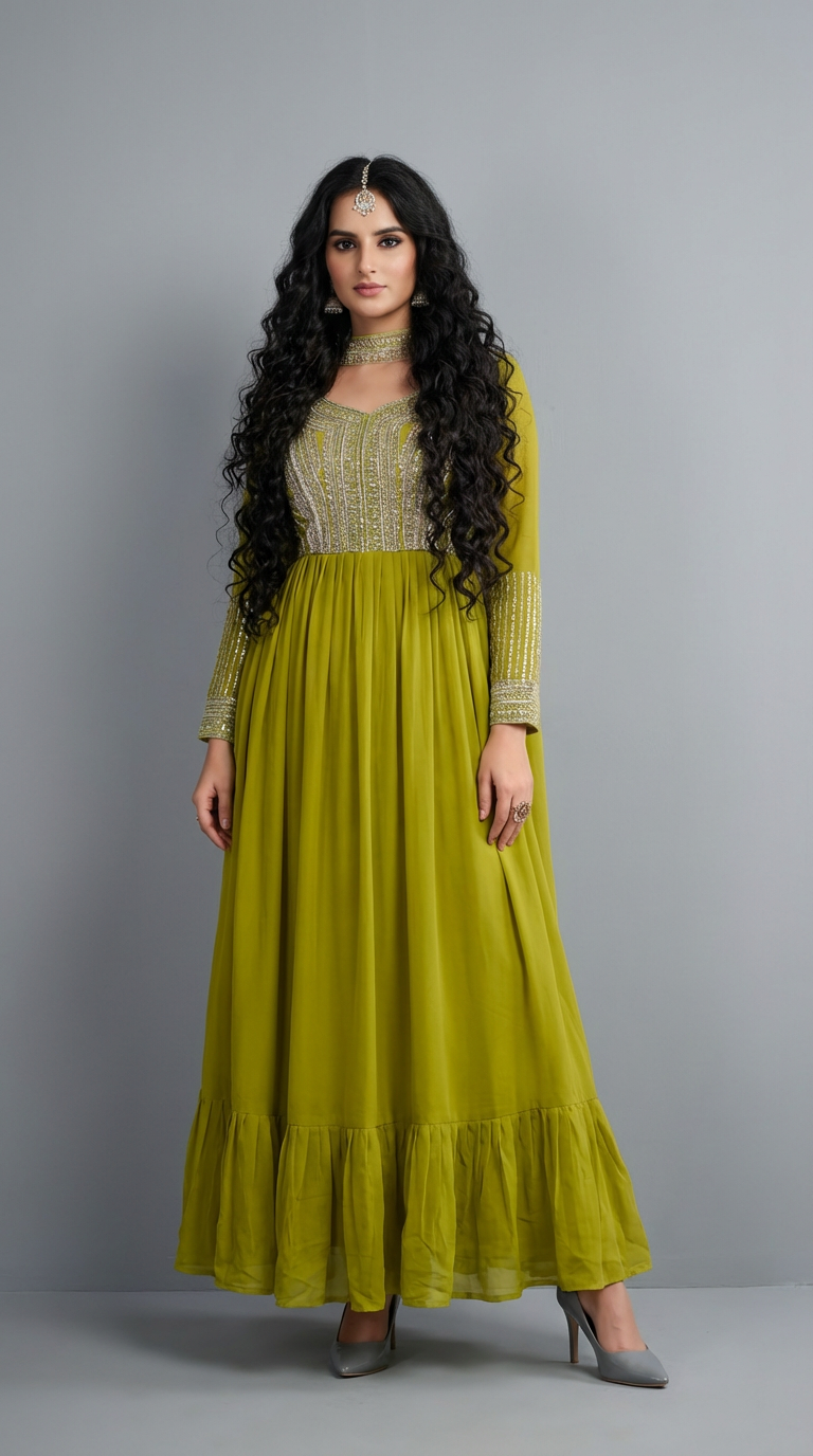 Olive Green Star Georgette Embroidered Gown with Beaded Sequins Dupatta – Wedding & Festive Wear
