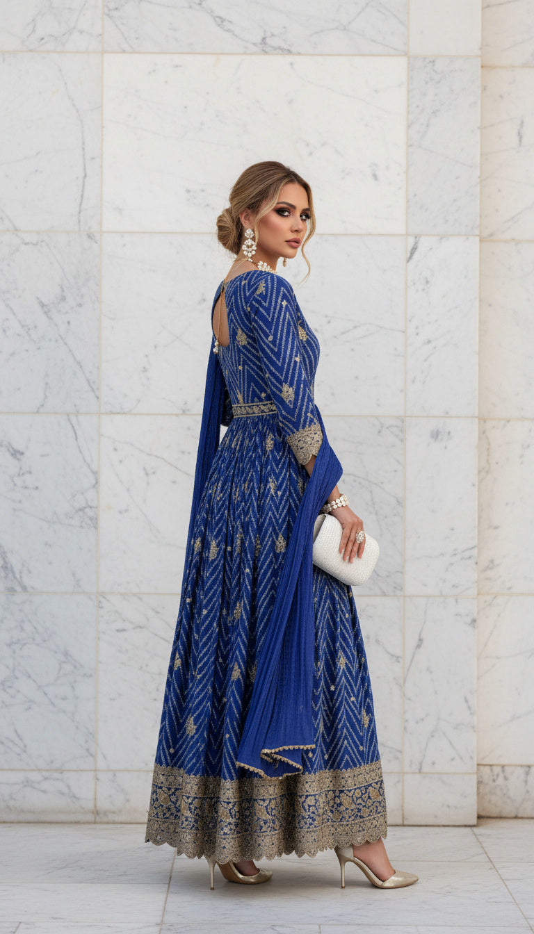 Step into refined elegance with this premium three-piece gown set, designed to deliver a statement look with luxurious detailing. Crafted from real premium Chinon silk, this ensemble features a rich, heavy embroidered finish on both the front and back, creating a striking balance of sophistication and grace.