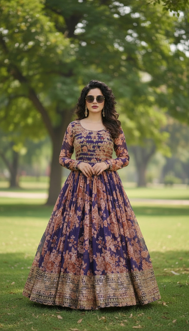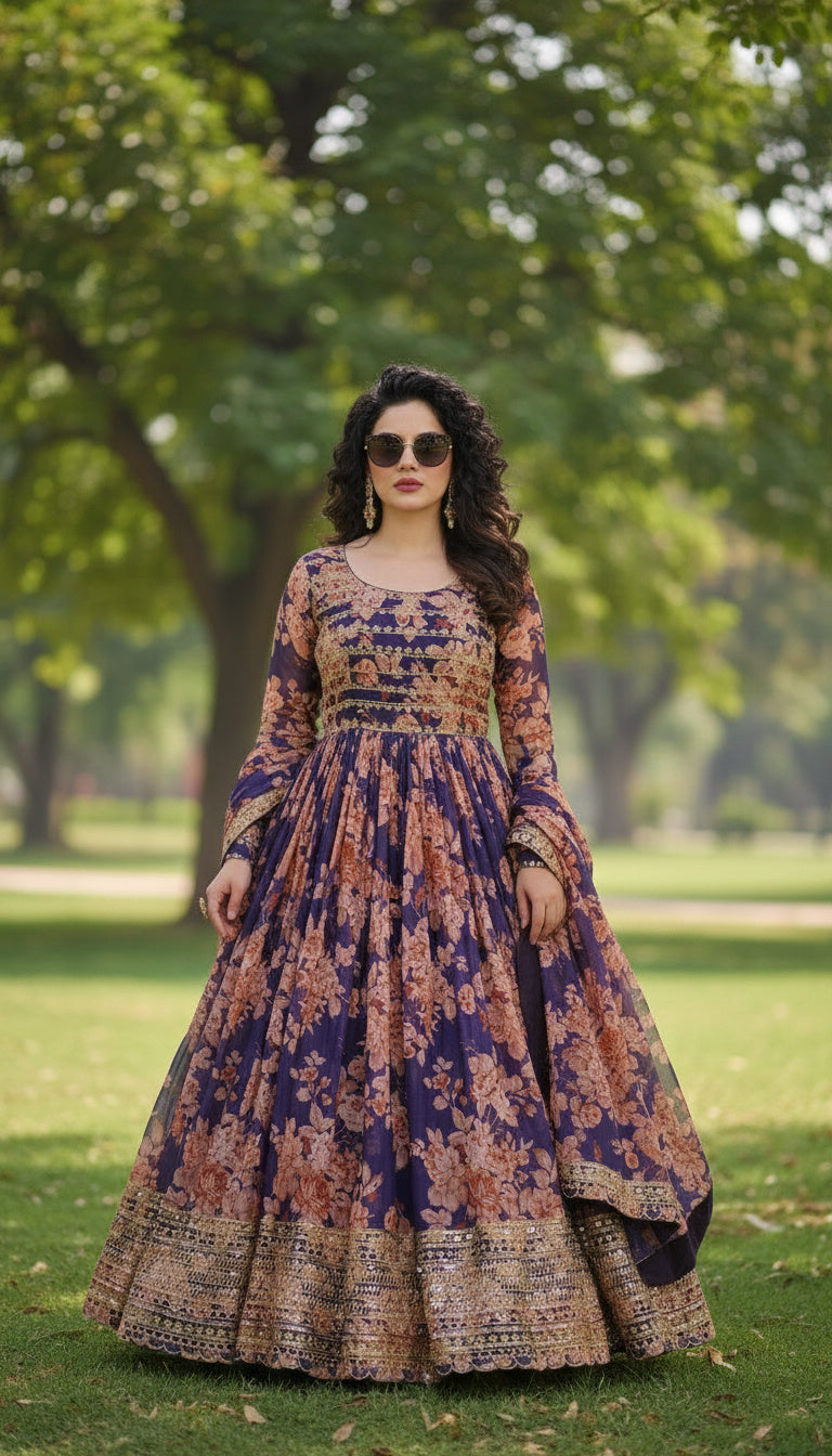 Make a graceful statement in this Plum Purple Premium Silk Satin Gown Set featuring rich floral digital prints enhanced with intricate embroidered sequins detailing. The structured bodice with horizontal embroidery lines adds definition, while the flowing Anarkali flare creates elegant movement.