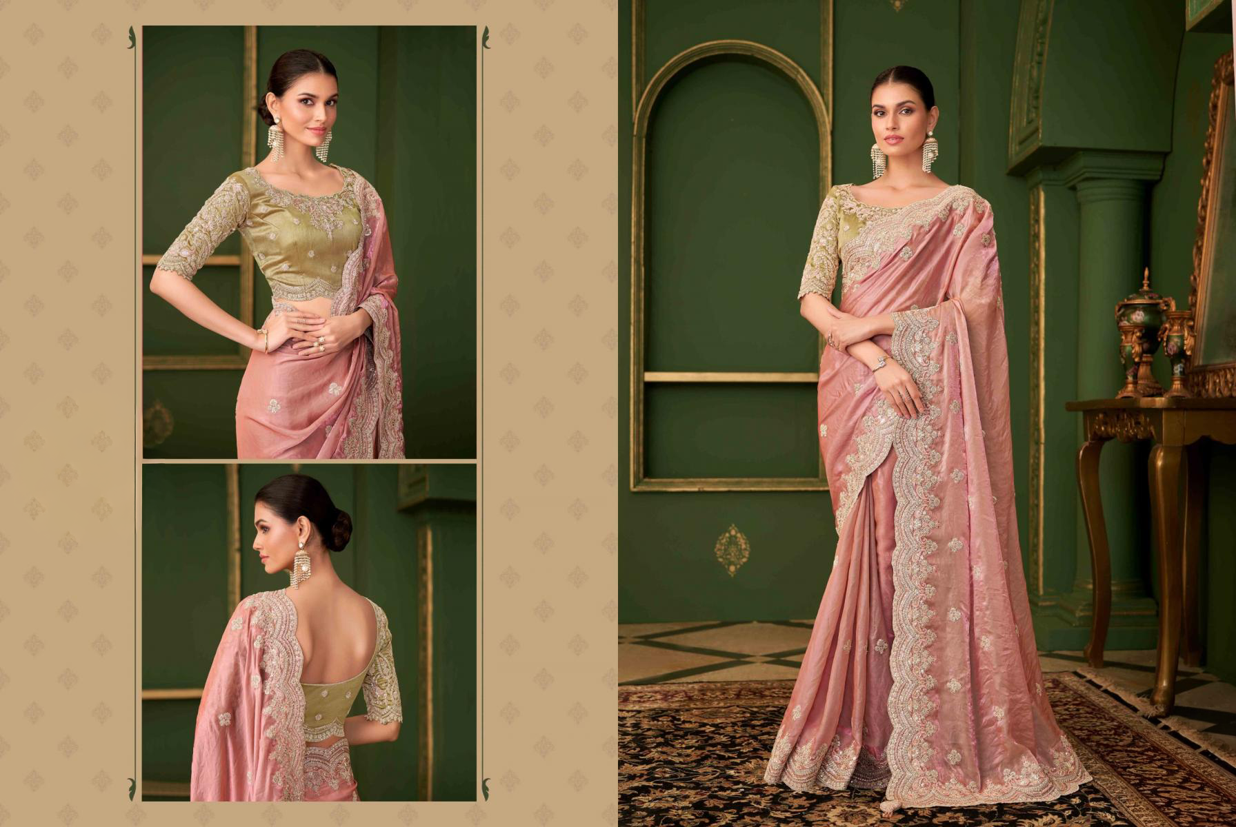 Elevate your elegance with the Rose Blush Saree from Vistavelle Fashion’s Royal Heritage Collection — a masterpiece that blends soft romance with regal charm. This saree features a graceful dusty rose-pink hue paired with a contrasting olive-gold embroidered blouse, creating a timelessly sophisticated look.