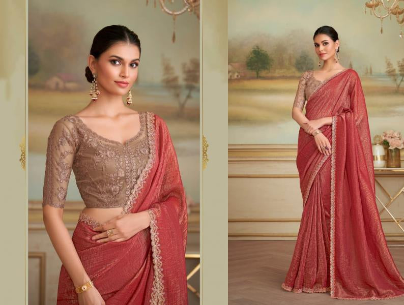 Bold and majestic, this Rust Red Georgette Saree radiates regal charm with its rich texture and intricate detailing. The flowing georgette drape enhances graceful movement, while the beautifully embroidered stitched blouse and delicate border work elevate its luxurious appeal.