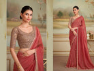 Rust red georgette saree with stitched embroidered blouse. Elegant wedding and festive wear. Ships from USA.