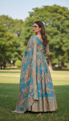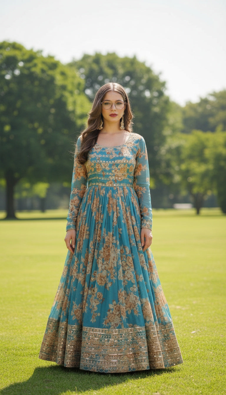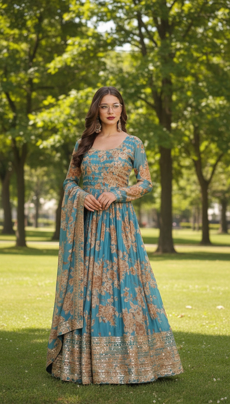 Elevate your festive wardrobe with this Teal Blue Premium Silk Satin Gown Set, designed with rich digital floral prints and intricate embroidered sequins detailing. The flowing Anarkali silhouette creates a graceful, flattering drape, making it ideal for weddings, receptions, and grand celebrations.