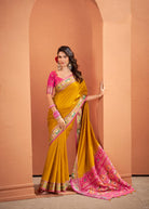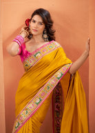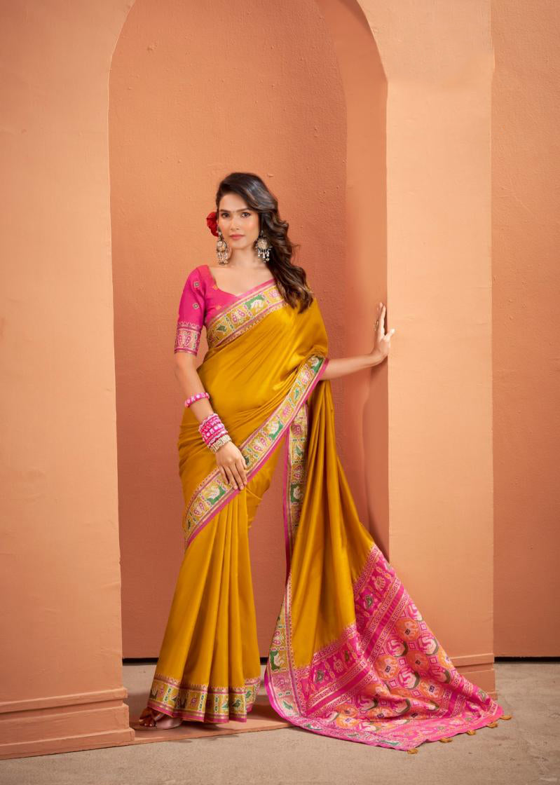 The premium Patola silk fabric offers a smooth texture with a subtle natural sheen and a graceful fall, enhancing the silhouette with effortless elegance. The warm mustard tone paired with bold pink detailing creates a regal yet lively look, making this saree a perfect choice for weddings, festive celebrations, cultural occasions, and family gatherings.