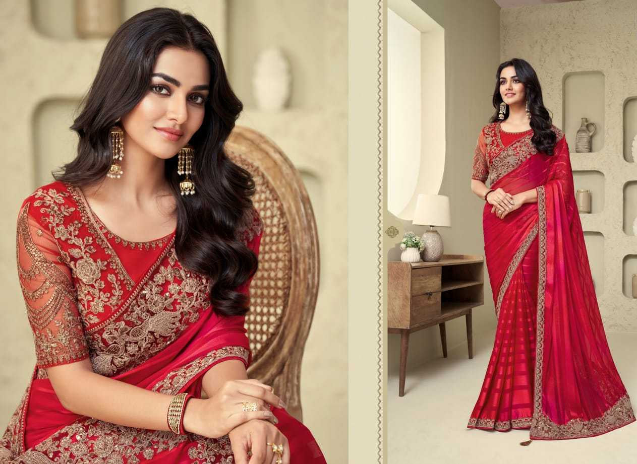 Make a powerful statement with this breathtaking Regal Red Shimmer Silk Saree, designed for grand celebrations and unforgettable entrances. The rich red tone radiates confidence and elegance, while the luminous silk texture enhances the saree’s graceful fall.
